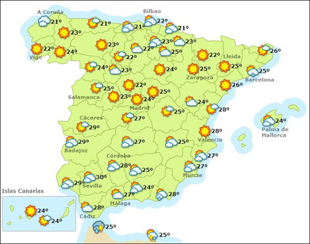 Balearerne får i dag og i morgen nogen sol med op til 27 grader, og det holder tørt. Mandag, tirsdag og onsdag stort set uændret og helt op til 29 grader, men fra torsdag bliver det mere skyet, og resten af ugen kan der kommer byger. Efterhånden også faldende temperaturer.