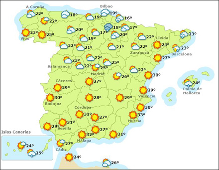 Vejr i Spanien, lørdag kl. 15:00