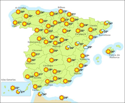 Mallorca og de andre Baleariske Øer får efterhånden mest solrigt vejr. I løbet af dagen opklaring, men stadig enkelte byger. I nat klart og tørt, og i morgen mest solrigt og op til 26 grader. Hele næste uge solrigt og op til 27 grader med svag vind fra østlig retning. Sidst på ugen mere skyet og efterhånden også nogen vind.