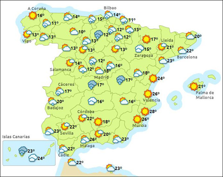 Costa Blanca får hele ugen tørt og ret solrigt vejr. I dag op til 25 grader, let til frisk vind fra fra vest og om natten ned til 18 grader. I morgen formiddag en overgang ret blæsende fra vest, men i løbet af eftermiddagen lægger vinden sig igen. Mellem 20 og 24 grader. Mandag og tirsdag blæsende fra vest og mest skyet men tørt. Onsdag lægger vinden sig, og resten af ugen bliver det mest solrigt og mellem 16 og 22 grader.