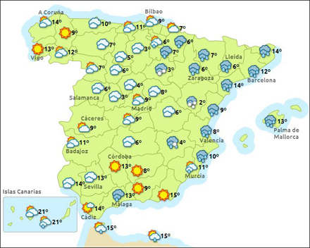 Vinteren har holdt sit indtog i Spanien, og det er blevet koldt, blæsende og vådt i hele landet. I de nordøstlige egne kuling og i de østlige egne kraftig nedbør. Det våde og kolde vintervejr fortsætter ind i næste uge, og temperaturerne falder yderligere.
