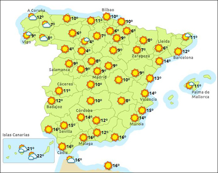 Vejret bliver stadig vinterkoldt, men knapt så blæsende og vådt som i forrige uge. Den forlængede helligdagsweekend er en oplagt mulighed for at tage en tur op i sneen. I Sierra Nevada skinner solen, og der er 14 km pister at boltre sig i. Men nyd det, for midt på ugen bliver det mere ustadigt og skyet.