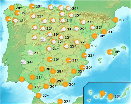 Også Costa Blanca slipper for den værste hedebølge og får hele ugen stabile sommertemperaturer på mellem 24 og 33 grader, lokalt kan det blive lidt varmere. I weekenden letskyet og op til 33 grader i morgen med vind fra skiftende retning. Fra mandag let til frisk vind fra nordvest og uændrede temperaturer. Næste weekend en smule køligere.