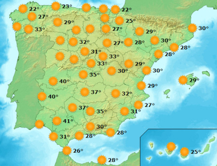 I løbet af søndagbliver det op til 38 grader eller mere på Gran Canaria, Tenerife, La Gomera, La Palma og El Hierro. For nordsiden af Gran Canaria og hele Fuerteventura og Lanzarote er der ”gult” varsel for temperaturer på omkring 35 grader.