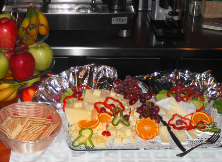 Til forret er der salat med diverse røget fisk, cognac gravet lask med dild sauce, tarteletter med ostegratineret høns i asparges, reje cocktail eller friturestegt camembert.