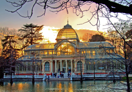 Krystalpaladset i Buen Retiro Park ser flot ud i solnedgangen