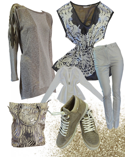 Nü by Staff strik 129 €, Gustav silketop 159 €, Gustav skjorte 139 €, Pardon buks 99 €, Amust Canvas taske 59 €, Amust sneakers 129 €