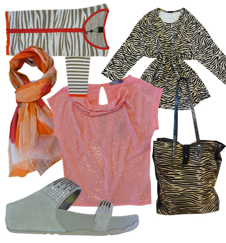 Choise cardigan 89 €, Choise bluse 69 €, Amust tørklæde 29 €, Gustav t-shirt 99 €, Amust taske 149 €, Fit-flop sandal 99 €