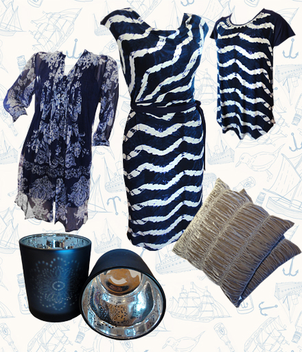 Kjole 89 €, Derhy kjole 99 €, Derhy T-shirt 69 €, TineK pude 79 €, Brøste glas til fyrfadslys 8 €