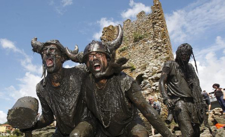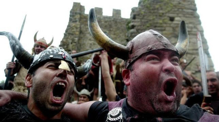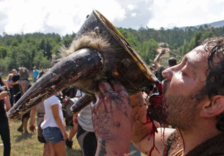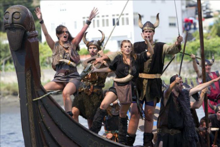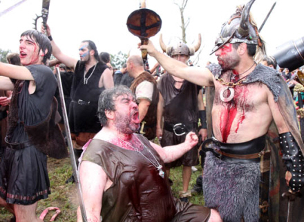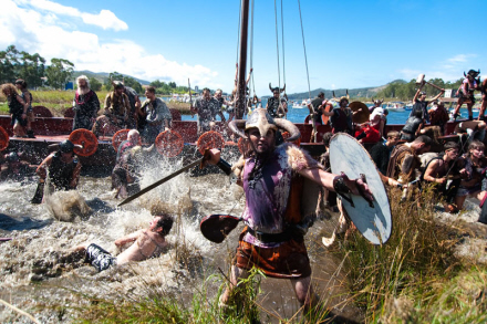 Men bare rolig – det er ikke rigtigt blod, der drypper ned over ansigtet, men vin, og der er smil på læberne, når deltagerne i den årlige vikinge-fest opfører kampen mellem de lokale og de grusomme mænd fra nord.