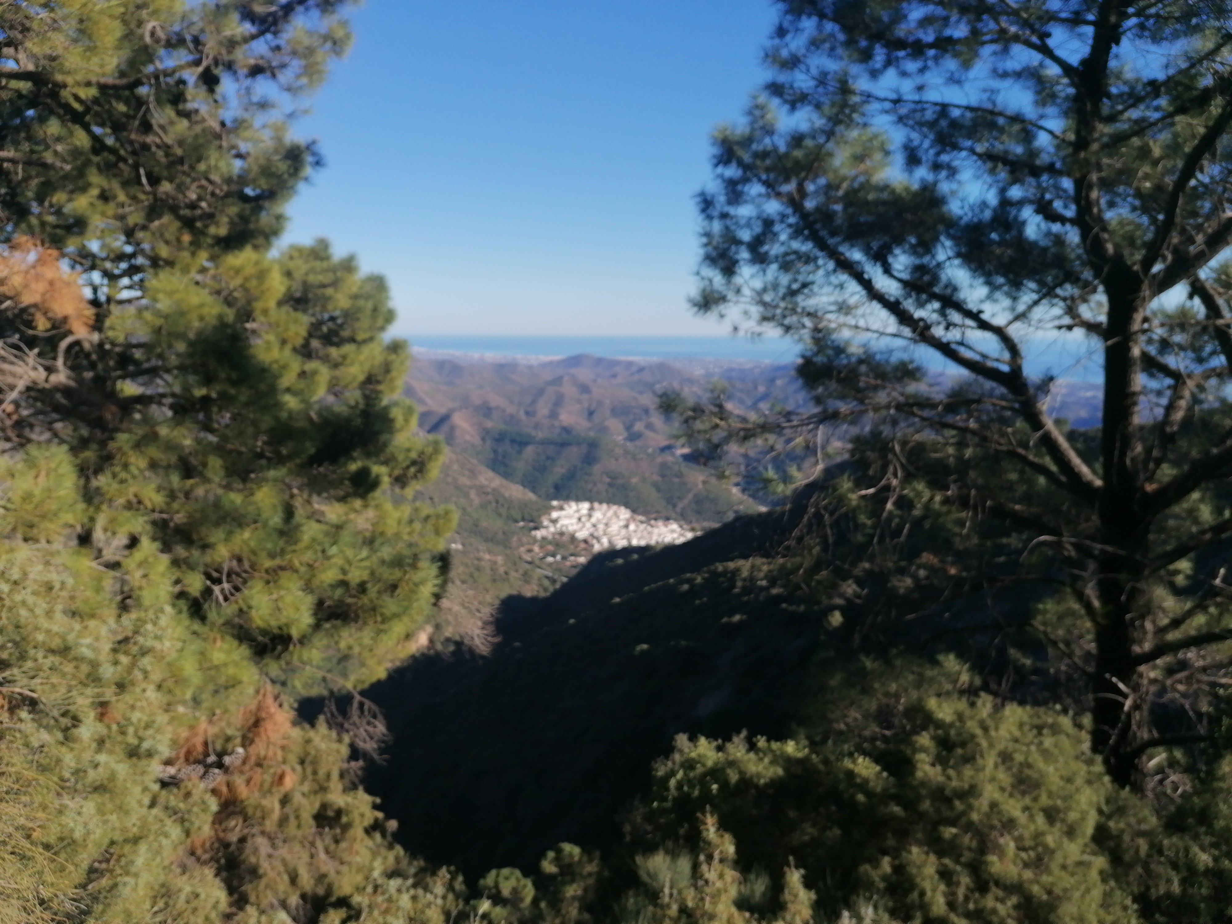 Den første del af ruten går på en behagelig, bred skovvej, men det varer ikke længe, før vi drejer af og fortsætter gennem skoven på en ujævn og mere stenet sti. På den første strækning ser vi bjergene omkring os og den lille bjergby Ojén, men det varer ikke længe, før vi får frit udsyn over hele kysten fra Mijas til Marbella.