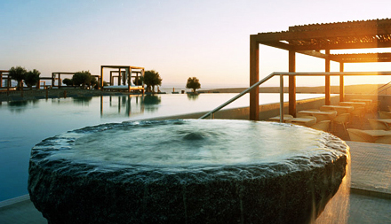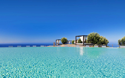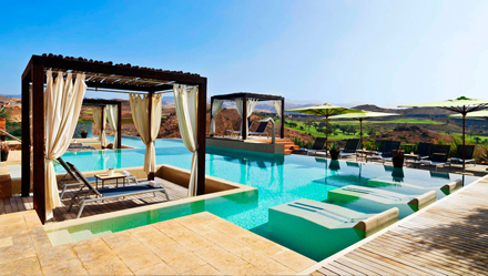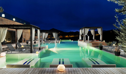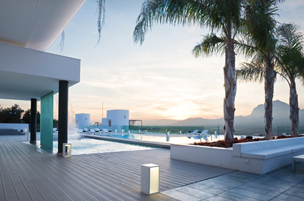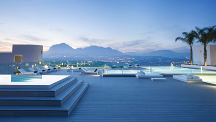 Hotellet har flere swimmingpool på forskellige niveauer, der synes at svæve over landskabet, værelser i tidløst design med chaise-longue'er på altanerne og barer og restauranter, der tilbyder et varieret udvalg af drikkevarer og retter.