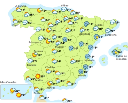 Valencia får i dag pænt meget sol, og det bliver tørt, men i løbet af eftermiddagen kommer der flere skyer på himmelen. I nat overskyet og kraftig nedbør, som fortsætter til morgen middag, hvorefter der kommer opklaring. Mellem 15 og 20 grader.