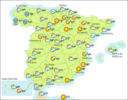 I resten af Spanien er det i dag skyet til letskyet og bortset fra lidt regn i de vestlige egne, bliver det mest tørt, og der kommer også nogen sol. Madrid har mellem tre – 15 grader, Barcelona mellem otte – 15 grader, Valencia to – 17 grader og Málaga mellem 11 – 18 grader.