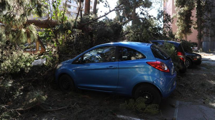 Adskillige biler og knallerter er blevet smadret af grene og væltede træer, og containere og reklameskilte er blæst omkuld.
