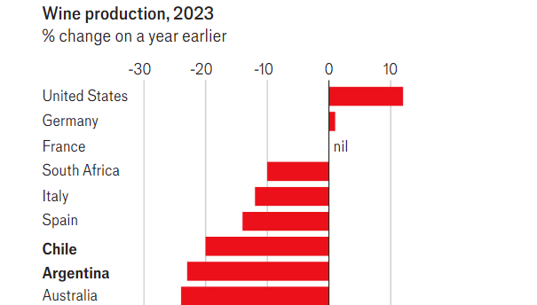 I Chiles tilfælde afhænger kunstvandingen af snesmeltningen fra Andesbjergene, som bliver mere og mere upålidelig, mens den overdrevne varme skader druerne. Vinproduktionen i Chile er faldet i fire af de seneste fem år. Situationen er den samme i resten af Latinamerika. Faldet i regionens vinproduktion tegnede sig for en tredjedel af det samlede fald i den globale produktion i 2023.