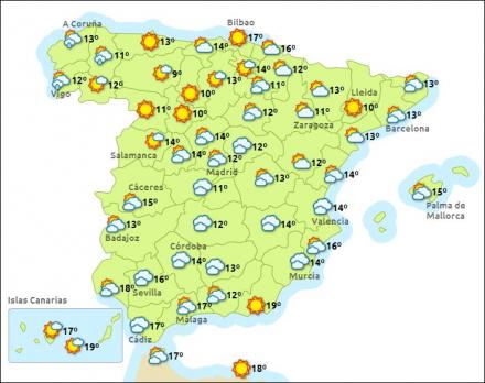 Madrid har i dag letskyet vejr med mellem en og 15 grader, Barcelona skyet og syv – 14 grader, Valencia skyet og fem – 14 grader, og det samme i Málaga dog lidt lunere med mellem ni – 17 grader.