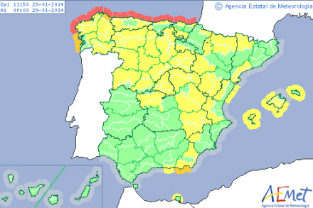 Kong Vinter banker igen på døren med mere sne, blæst og høje bølger. Der falder i dag op til 20 cm sne, mens de nordspanske kyster bliver ramt af otte meter høje bølger. Den nordlige del er i aller højeste beredskab nemlig rødt, orange i dele af syd og gult store dele af resten af landet.