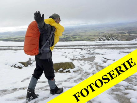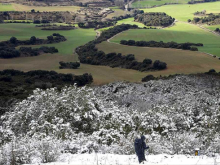 En vandrer trodser vejrforholdene på El Camino de Santiago, Alto del Perdón