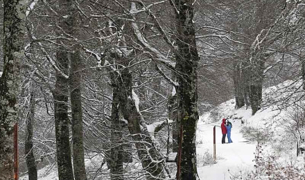 Et par går tur i skoven i Alto de Ibañeta, Navarra