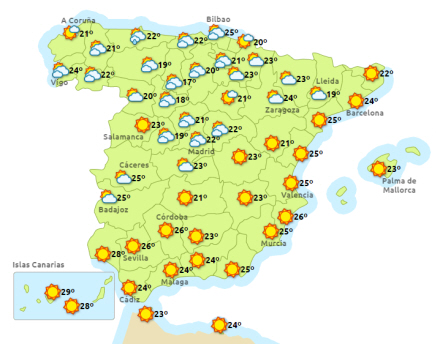 Valencia har haft en skyfri start på dagen, men hen over middag og resten af dagen kommer der enkelte skyer, men ikke mange. Temperaturen bliver ganske sommerlig med sine 14 til 29 grader.