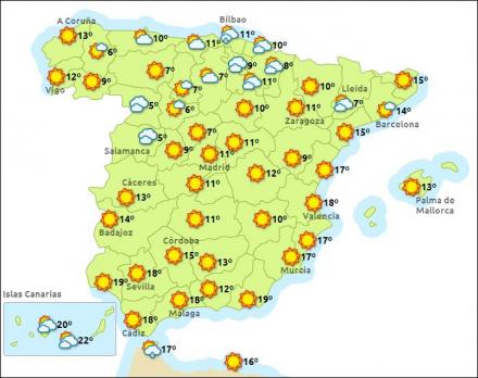Madrid har i dag solrigt vejr med mellem minus to – 15 grader, Barcelona letskyet og 6 – 16, Valencia sol og letskyet med mellem én – 18 grader og endelig sol over Málaga og mellem 11 – 20 grader.