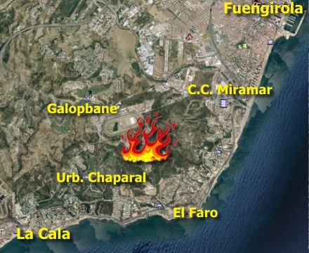 Klokken 17:20 modtog alarmcentralen de første opkald om, at der var opstået brand i et tørt område mellem urbanizacionerne Polarsol og La Ponderosa, og der blev omgående sendt flere brandbiler til stedet.