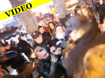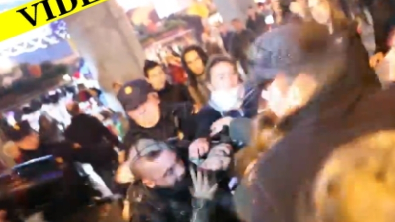 De 500 demonstranter kræver Justitsminister Alberto Ruiz- Gallardóns afgang og at forslag om den nye abortlov bliver trukket tilbage. På videoen kan man se protestanterne råbe ad betjentene, som trækker deres stave og slår.