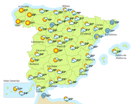 Vejret i Spanien, mandag klokken 14:00