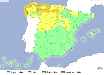 20 provinser er i forhøjet alarmberedskab, heriblandt Cantabrien, Galicien, Asturien, Navarra og Castilla y León. Langs kysterne er der varsel om bølger på fem meter, og indbyggerne advares mod at bevæge sig ud på moler og andre udsatte steder.