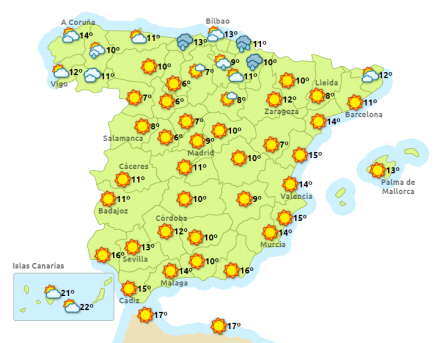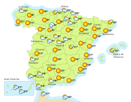 Dagtemperaturerne stiger i det centrale og nordlige Spanien, mens de falder ved kysten i det østlige Andalusien. Få ændringer i resten af landet. Nattemperaturerne er svagt faldende i store dele af halvøen. Frost i højtliggende områder.