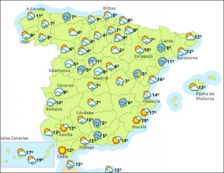 Madrid får i dag opklaring med mellem tre og otte grader, Barcelona overskyet med byger og seks – 14 grader, Valencia skyet med nogen nedbør og otte – 15 grader, og endelig får Málaga letskyet vejr med mellem 11 og 14 grader.
