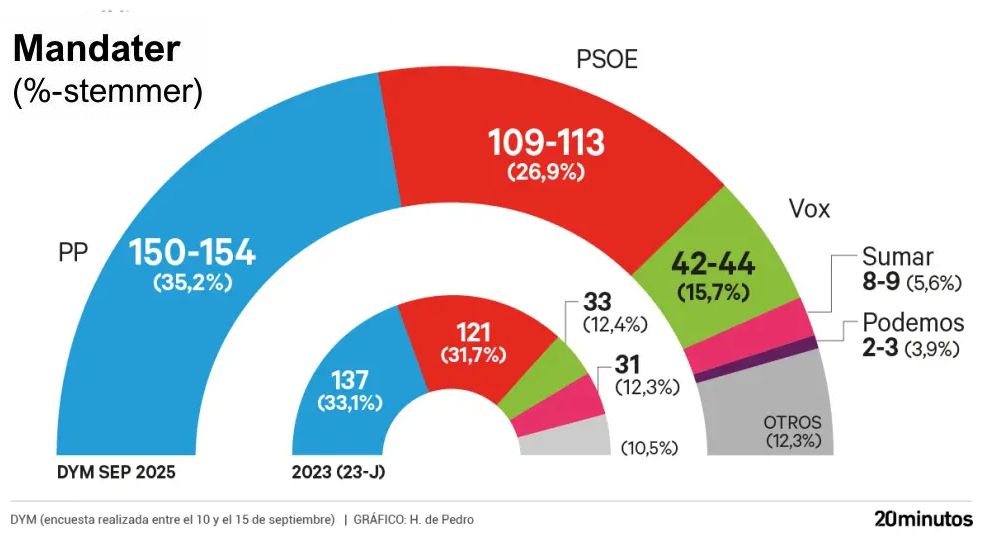 Meningsmålingen i september udført af analyseinstituttet DYM for 20minutos viser, at hvis valget blev afholdt i morgen, ville PP forblive det største parti, som meningsmålingerne har vist i månedsvis. PP’s forspring til PSOE er dog blevet mindre over sommeren, både på grund af et let opsving for PSOE – som for første gang i mange måneder er størst i den direkte vælgertilslutnings undersøgelse (uden justeringer) – og et fald for PP selv, hvis vælgerflugt til Vox nu når 900.000 vælgere. Feijóo ville være langt fra at kunne regere alene og have brug for Santiago Abascals mandater for at nå Moncloa-paladset.