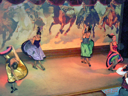 I saloonen spjætter damerne med benene under deres cancan-dans, mens pianisten dukker sig for at undvige de flyvende flasker under det efterfølgende saloon-slagsmål.