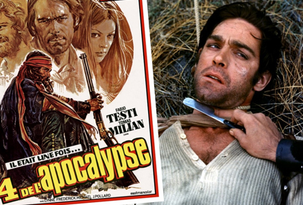Plakat og billede fra filmen 'Four of the Apocalypse' (I Quattro dell'apocalisse) fra 1975 med Fabio Testi i hovedrollen