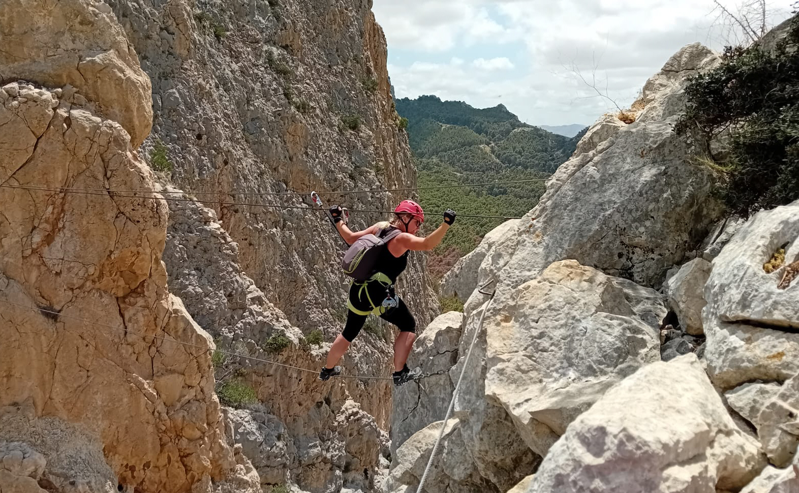 Efter adskillige højdemeter, stod vi pludselig foran den første forhindring: Svævebanen. Eller det vil sige et stålkabel spændt ud over kløften.