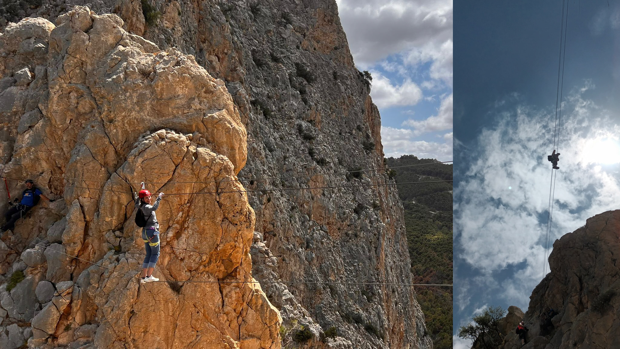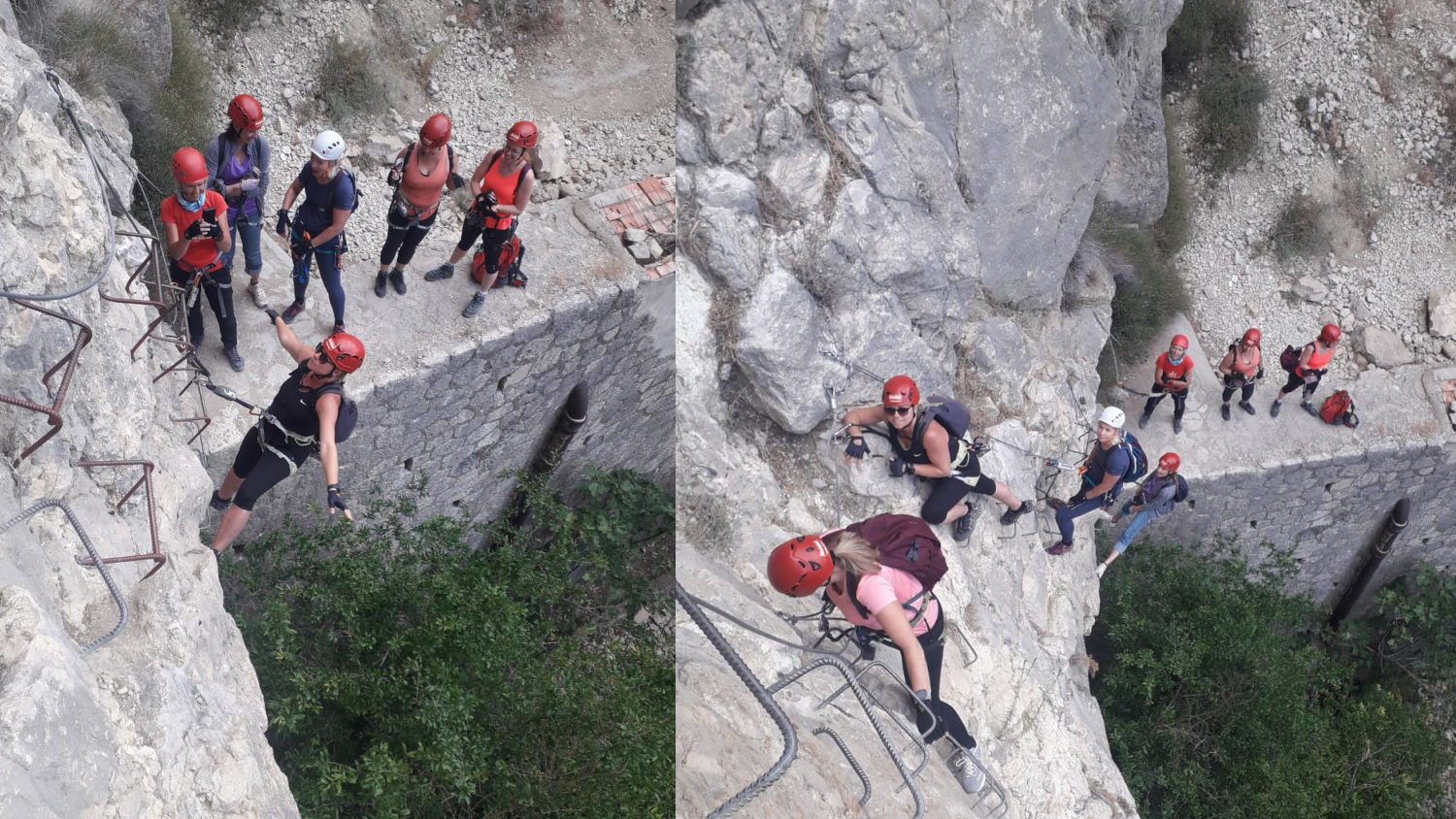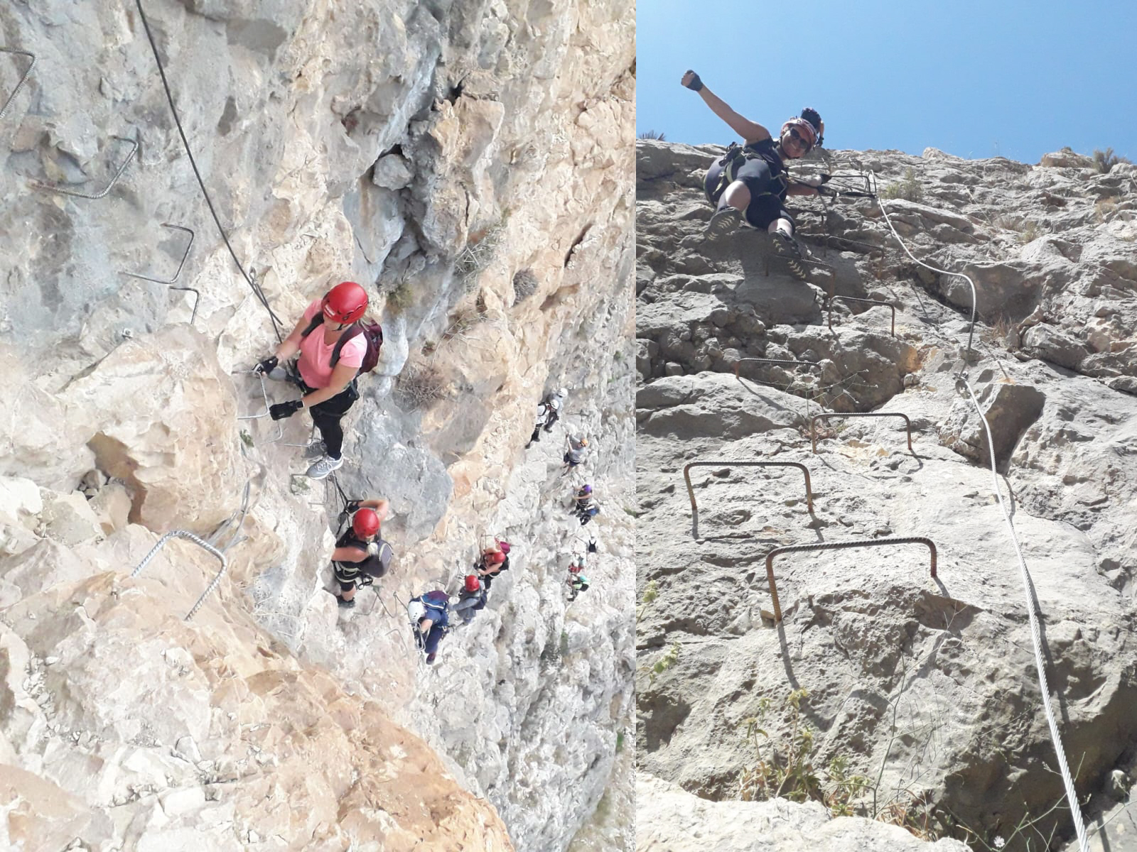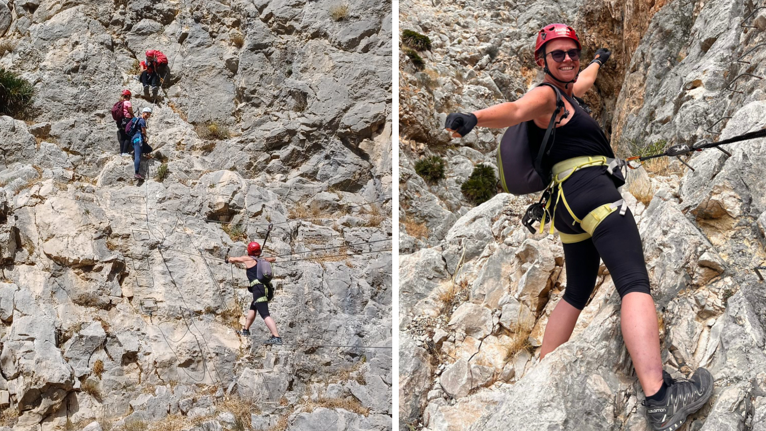 Turen startede lige på og hårdt med at kravle lodret op en helt masse meter. Først lavede vi dog en lille test af “formen”, hvor vi én efter én kravlede af sted. På det første metaltrin skulle vi klikke os os fast med karabinhagen på trinnet i hoftehøjde, “stole på udstyret” og give slip med begge hænder.